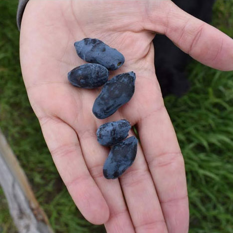 Catherine shows how Haskap berries (Honeyberries) are shaken from the bushes at Apple Bar Orchard.
